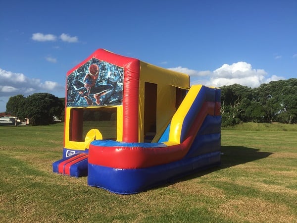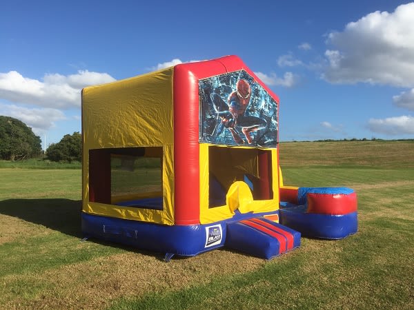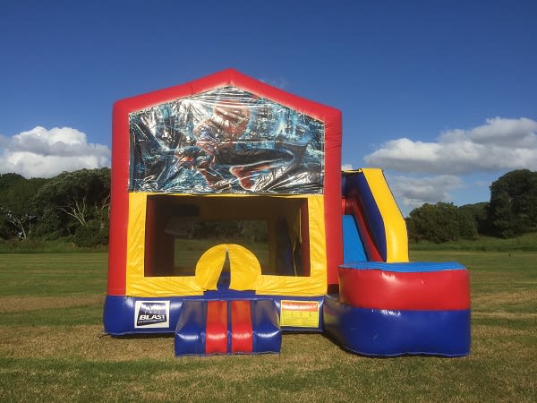 Bring superhero energy to your next event with the 4x5 Slide 🕷️ Spiderman Theme. This eye-catching jumping castle for hire combines a large jump zone, thrilling slide, built-in basketball hoop and a rain/shade cover. Perfect for birthday parties, school fairs and community events across the Sydney region. 🕸️🎉